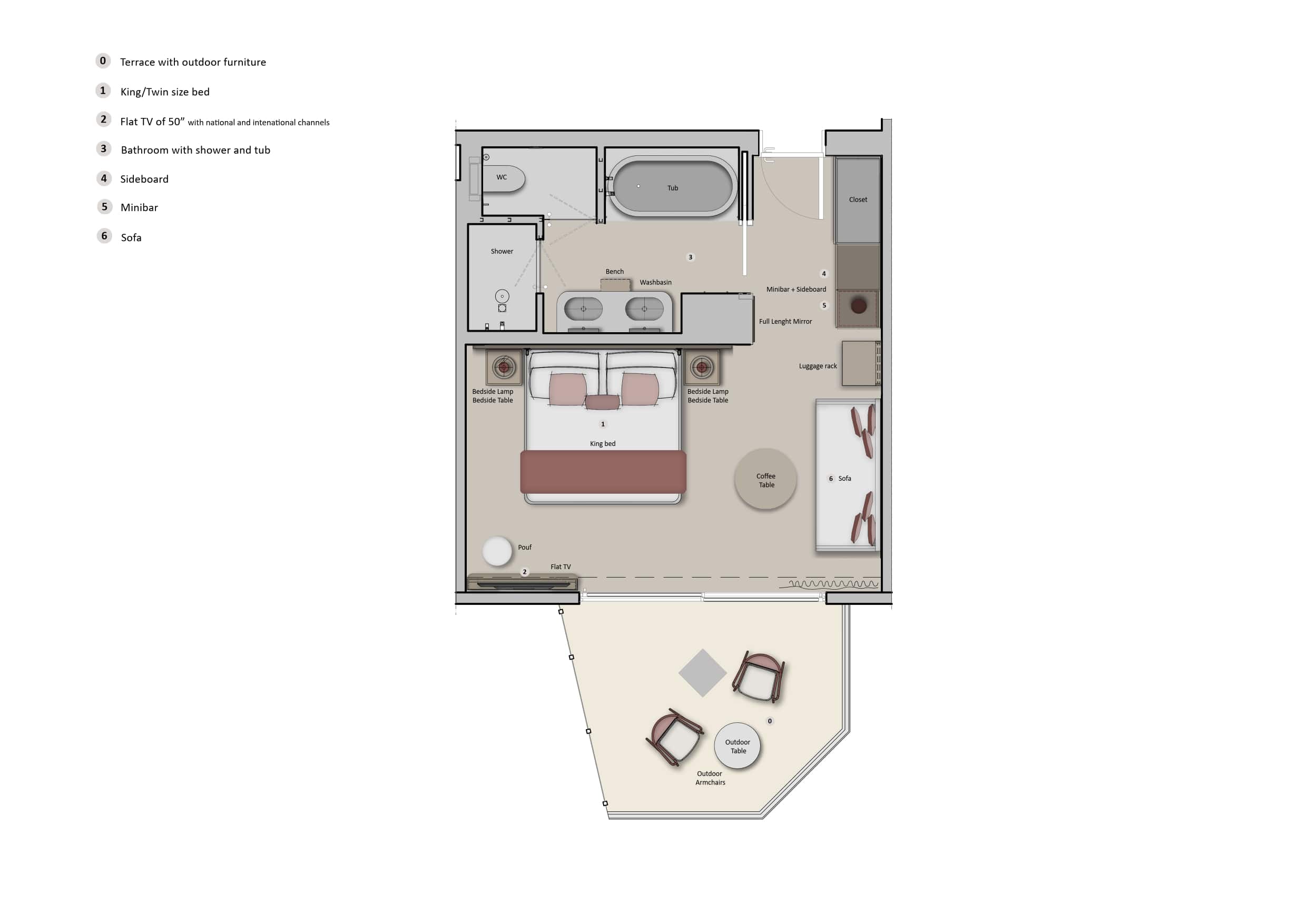 378 voll ausgestattete Suiten mit einem Balkon und fantastischer Aussicht, die einen rustikalen mediterranen Stil mit modernsten Einrichtungen kombinieren.