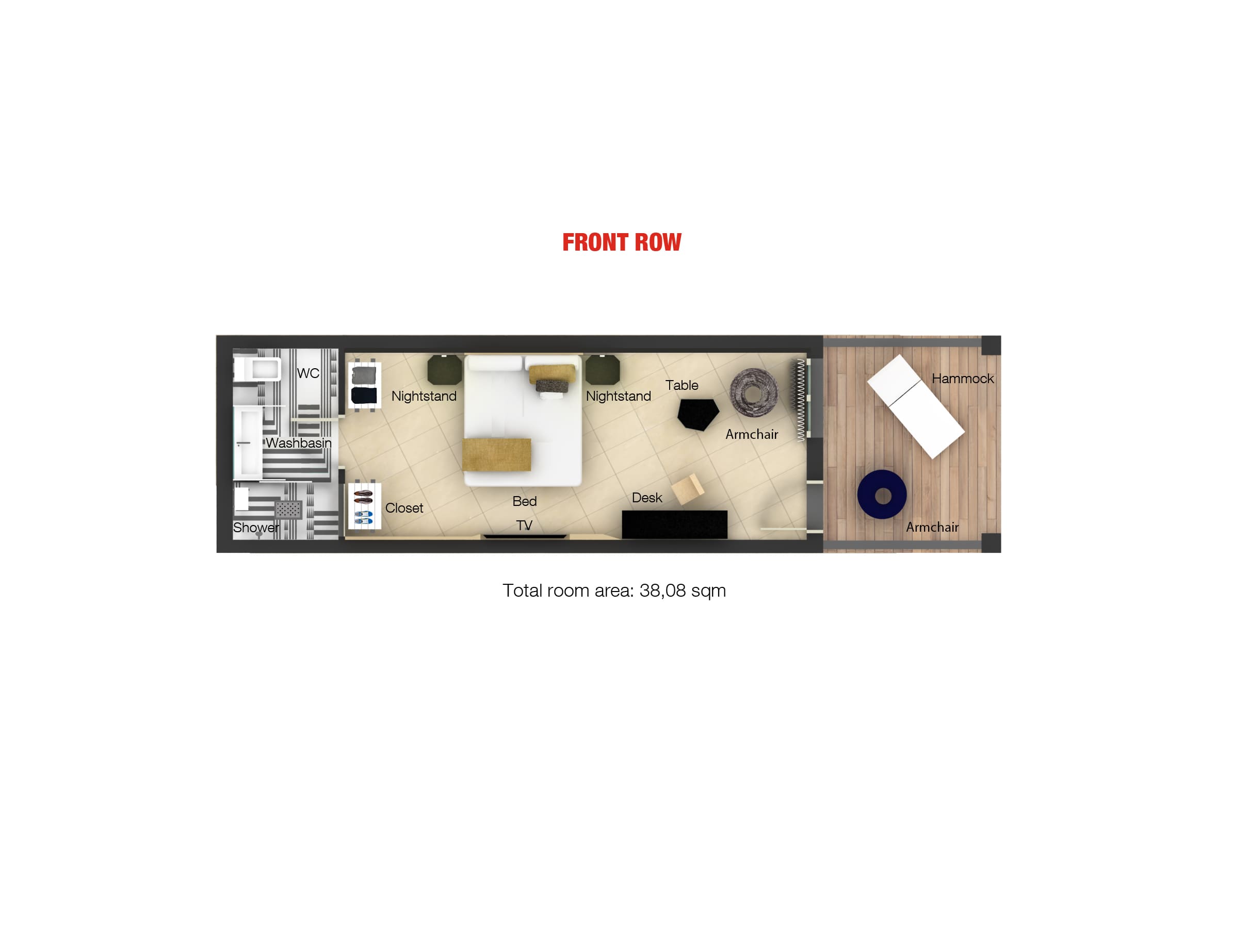 Próximo ao palco. Este quarto superior possui design único, todos os confortos modernos e acesso direto à principal área de festas.